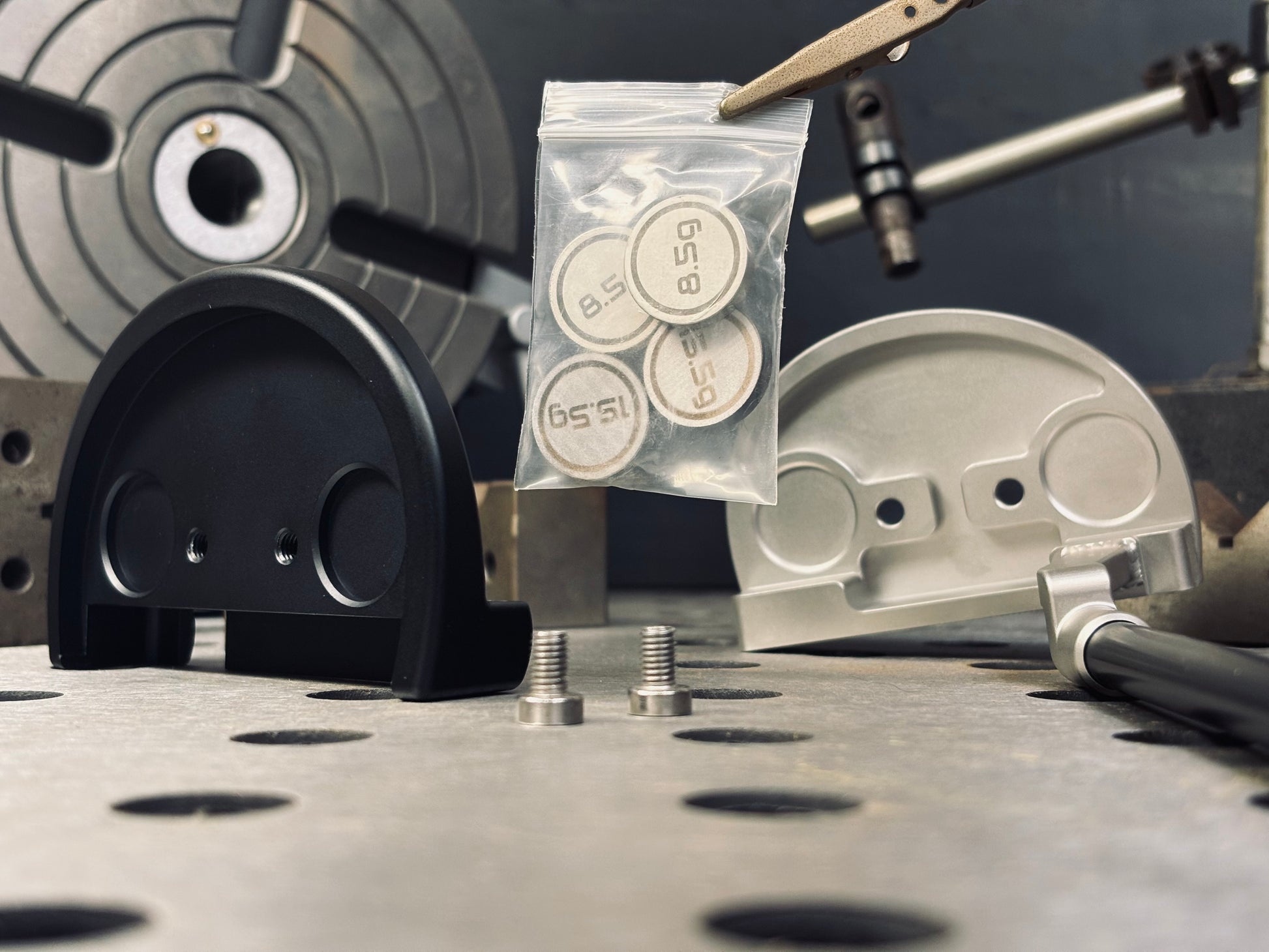Two-piece design machined from 303 stainless steel and 6061 anodized aluminum.